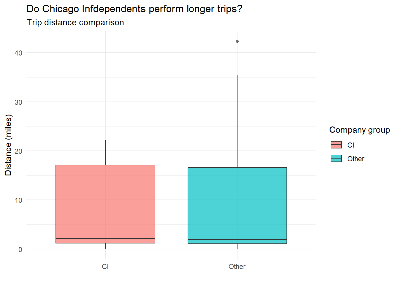 | Q2: Company | Chicago Independents have highest tip rate (≈95%) | Company difference isn’t due to when they drive |